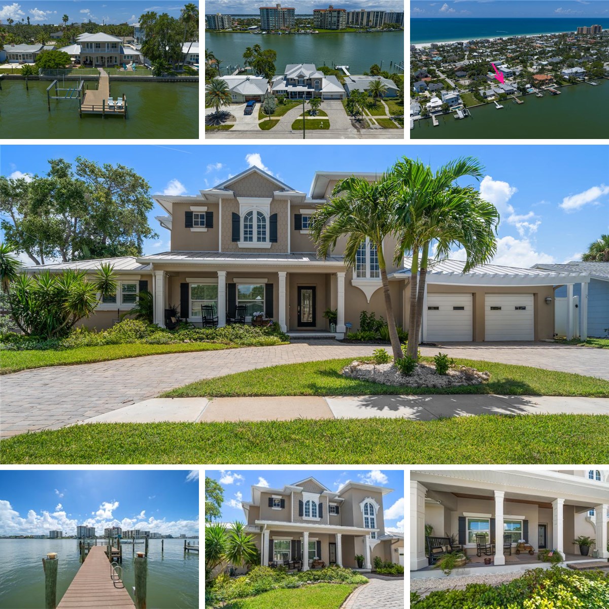 Experience the ultimate coastal lifestyle in this beautifully renovated home on the desirable North End of Clearwater Beach, where every detail evokes the essence of relaxed seaside living. A pavered circular driveway and welcoming front porch set the stage for this bright, open retreat, ideal as a full-time residence or beach getaway. Inside, the home unfolds in a seamless blend of warm coastal tones and wood-look ceramic tile floors, leading to a spacious family room where sliders open to a versatile sunroom offering endless Intracoastal views. The recently renovated kitchen is a standout with stainless steel appliances, quartz countertops, a custom pantry, and water views. A glass door leads to a backyard paradise, making entertaining easy and effortless, perfect for gatherings after a day on the water. Downstairs, three well-appointed bedrooms provide comfort and privacy, including one with an ensuite bath. Upstairs, the primary suite is a private sanctuary, complete with a reading loft, custom built-ins, space for a home office, a huge walk-in closet, electric blinds, and panoramic water views from bed. Step out onto your private balcony or retreat to the luxurious ensuite bath with tub and walk-in shower. Outside, enjoy multiple entertaining areas, ideal for soaking in tropical breezes, spotting dolphins and manatees, or launching a kayak or paddleboard and exploring the mangroves. A true boater’s paradise, and just a short walk to the beach, local restaurants, and shops. Recent upgrades include new HVAC and all-new electric downstairs. Move-in ready and waiting—don’t miss your chance to live the Clearwater Beach dream!